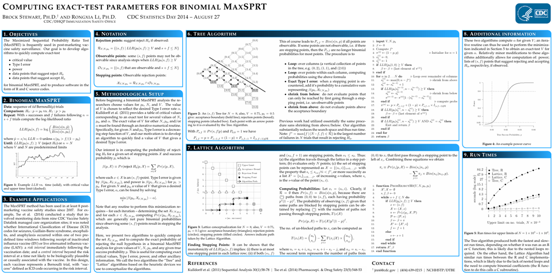 I invented algorithms to quickly compute the Type I error rate of sequential A/B tests under both a Binomial & Poisson design. I coded the algorithms in C, with optional interfaces in R or as a stand-alone DLL. My code also computes exact-test critical value, statistical power, & lists decision-making data points. Runtime < 1 second -- 3 seconds; the code it replaced required overnight-to-days.