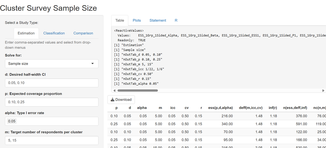 I used Python and R to create a web application that aids researchers in the deign of multi-stage, stratified cluster surveys. It computes the needed sample size -- or tells the researcher what size confidence interval can be achieved for a given sample size -- and outputs tables, graphs, and summary statements suitable for use in protocols and manuscripts.